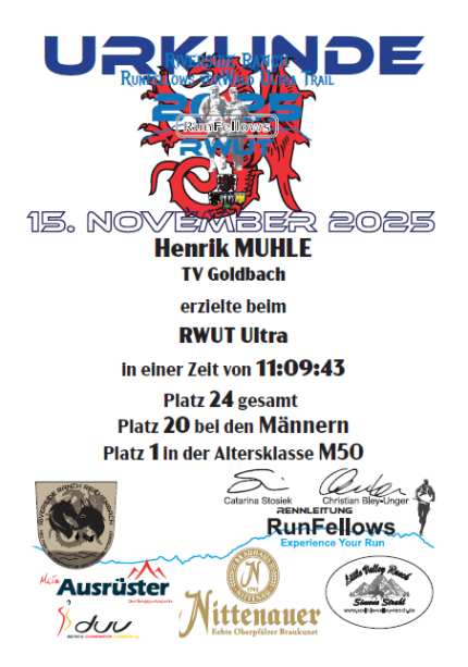 Viele Teilnehmer betonten den starken Zusammenhalt im Feld und das motivierende Miteinander, das den Charakter des Events prägt. Ebenso die hervorragende Organisation, die familiäre Stimmung entlang der Strecke sowie die gut ausgestatteten Verpflegungspunkte scheinen den besonderen Charme dieses Rennens auszumachen. Am Ende erreichten zahlreiche Läufer und Läuferinnen erschöpft, aber glücklich das Ziel und feierten gemeinsam einen gelungenen Wettkampftag bei dem Fellows VorWald Ultratrail. Mit einem AK-Sieg konnte Henrik besonders stolz und glücklich nach Hause fahren. Trailstrecke: 63,4 km Auszug aus der Ergebnisliste